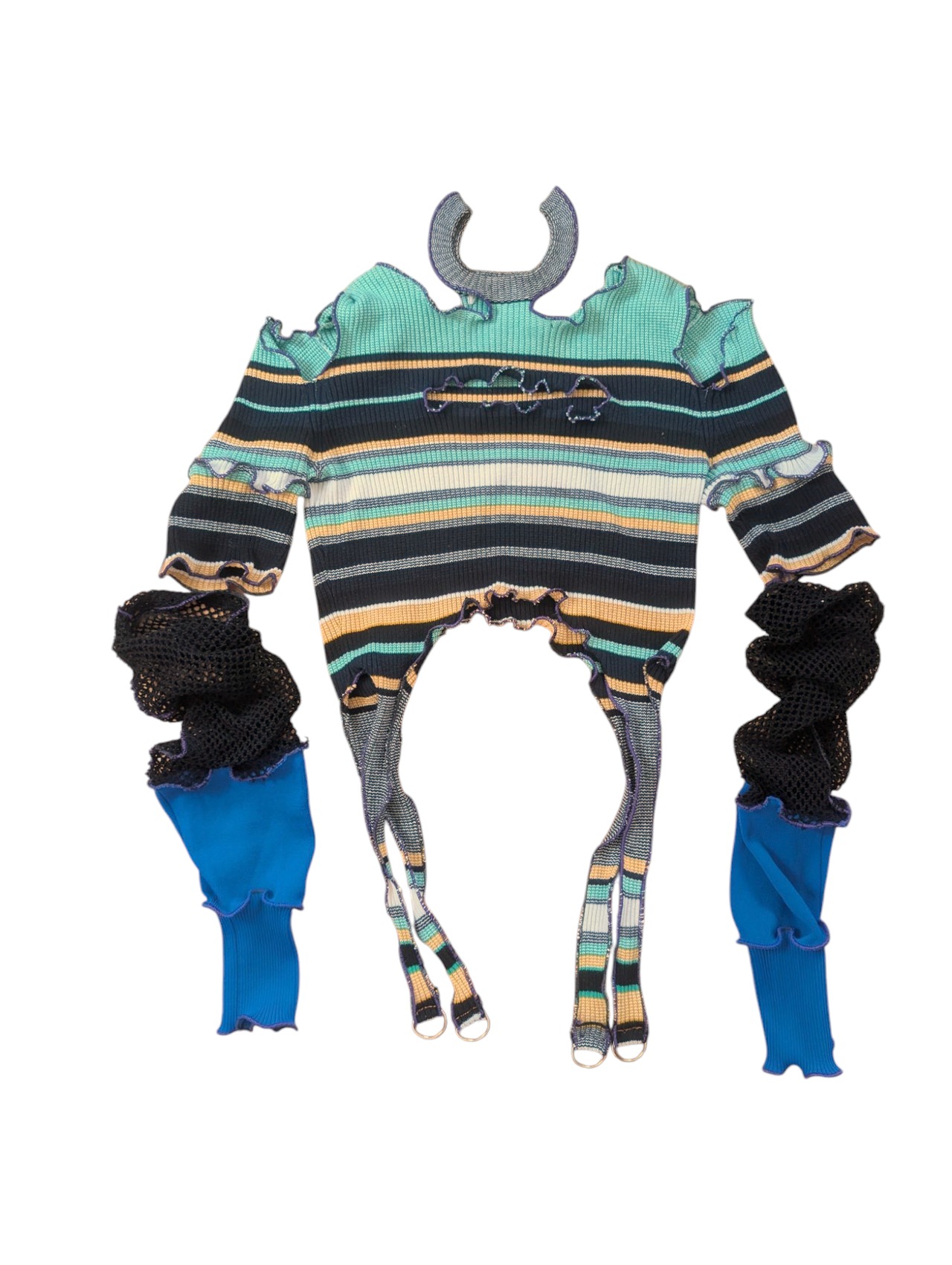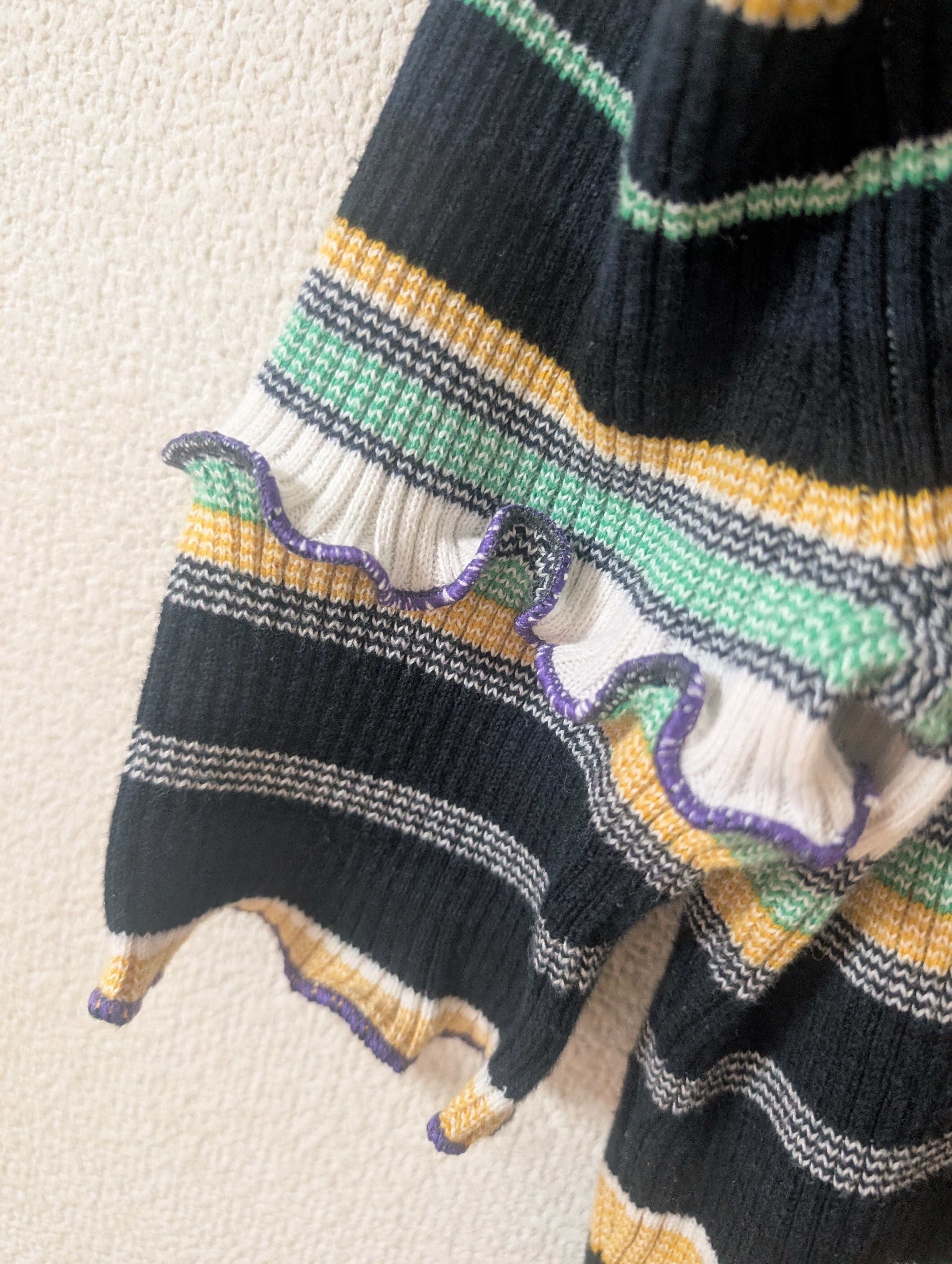 ボーダーのカットアウトデザインにしたリブ編みトップス、ストリートファッションスタイル。
