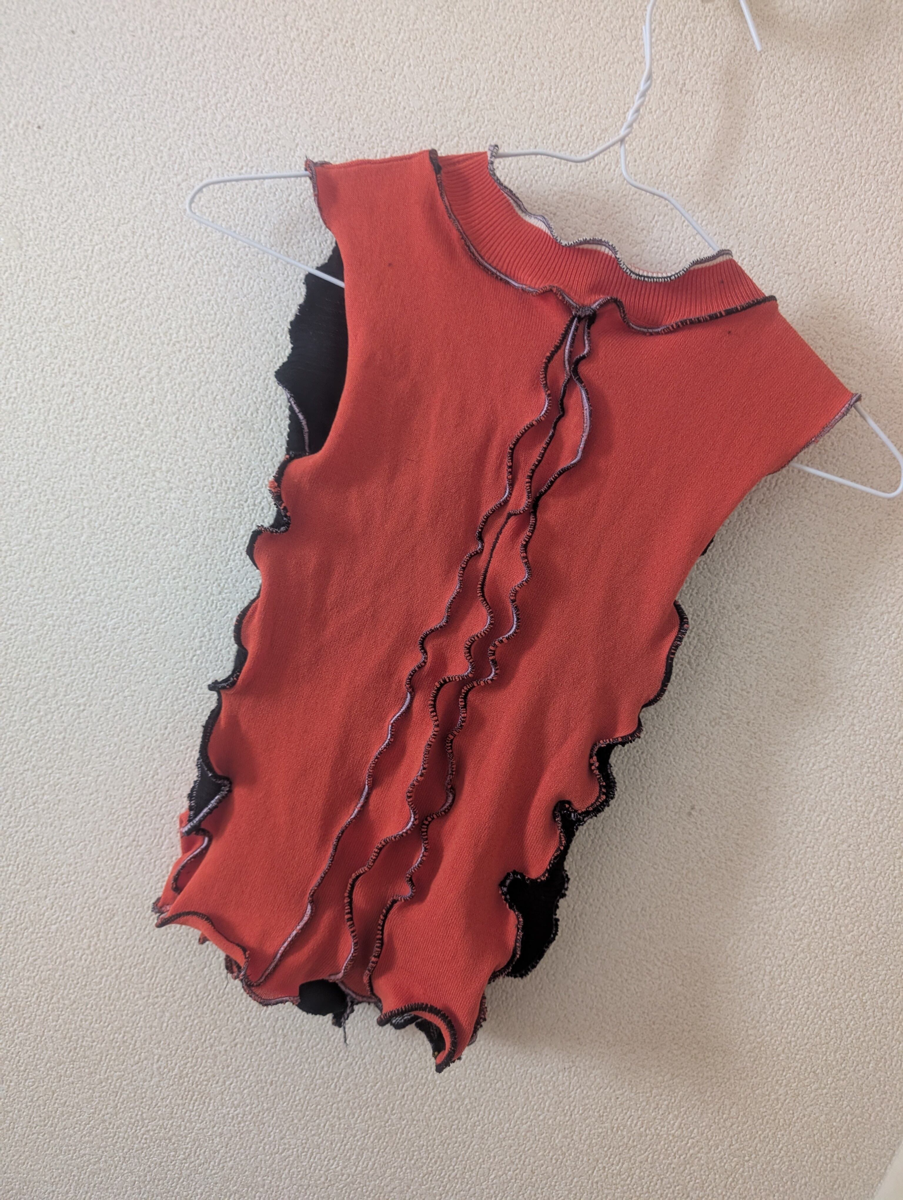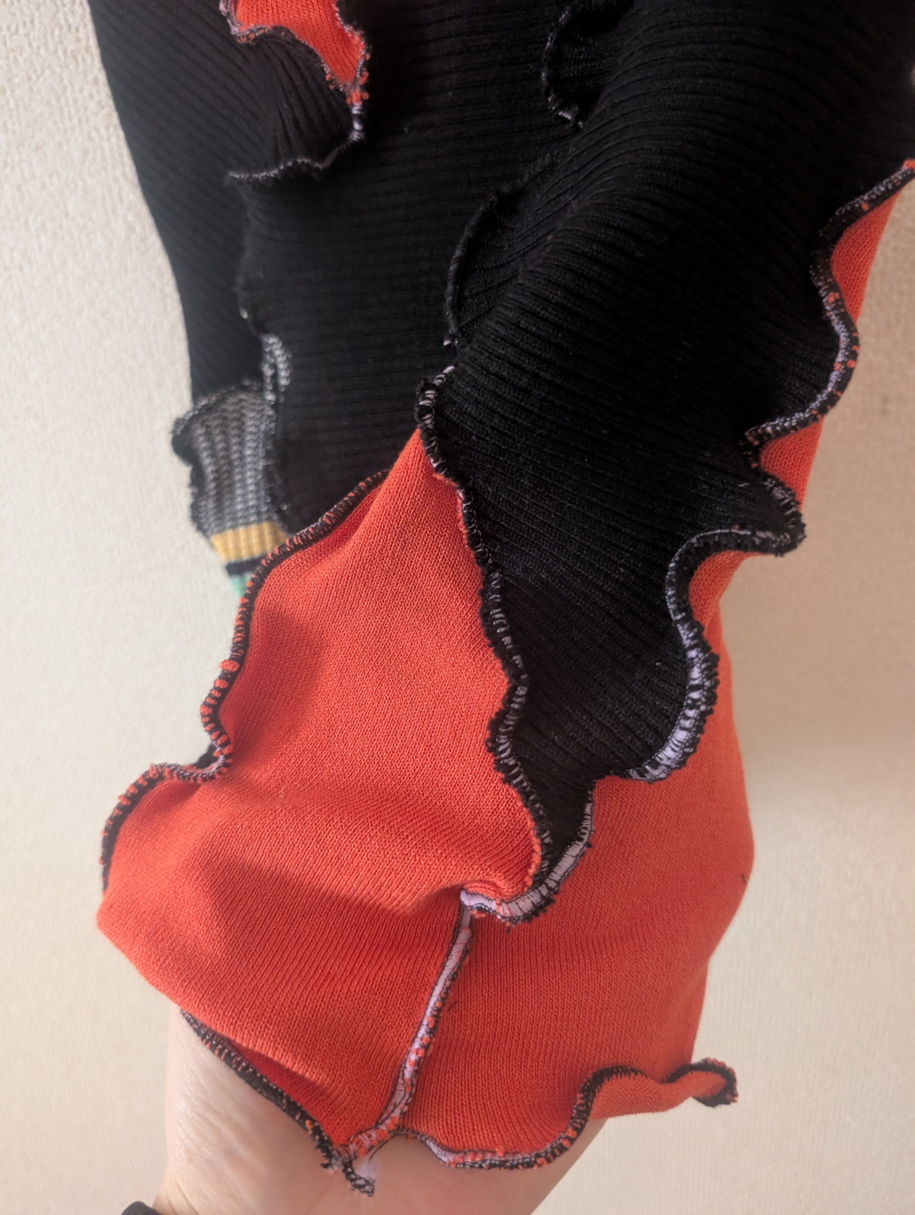 ユニークなフリルデザインのニットトップス、異素材の組み合わせが特徴。