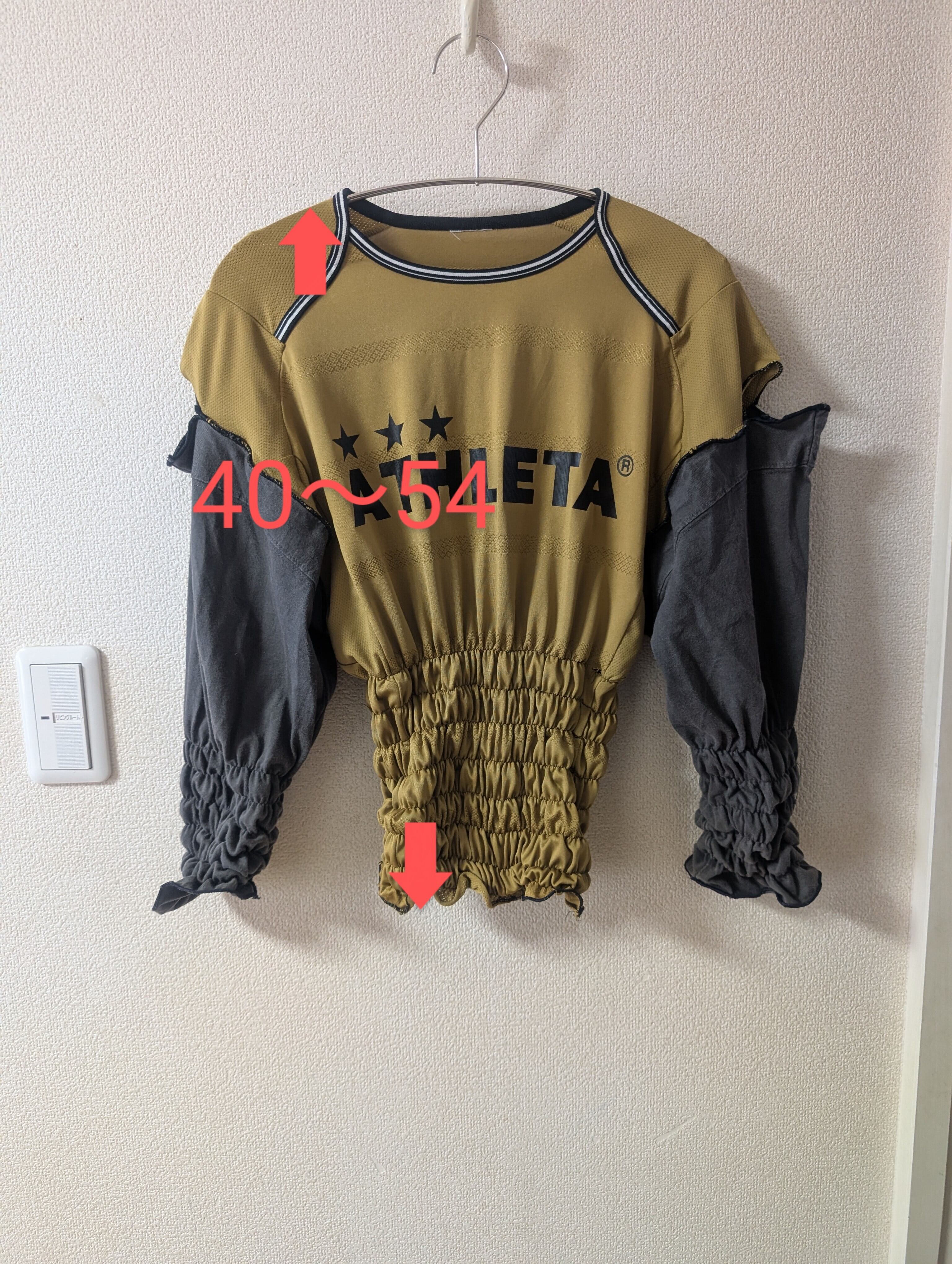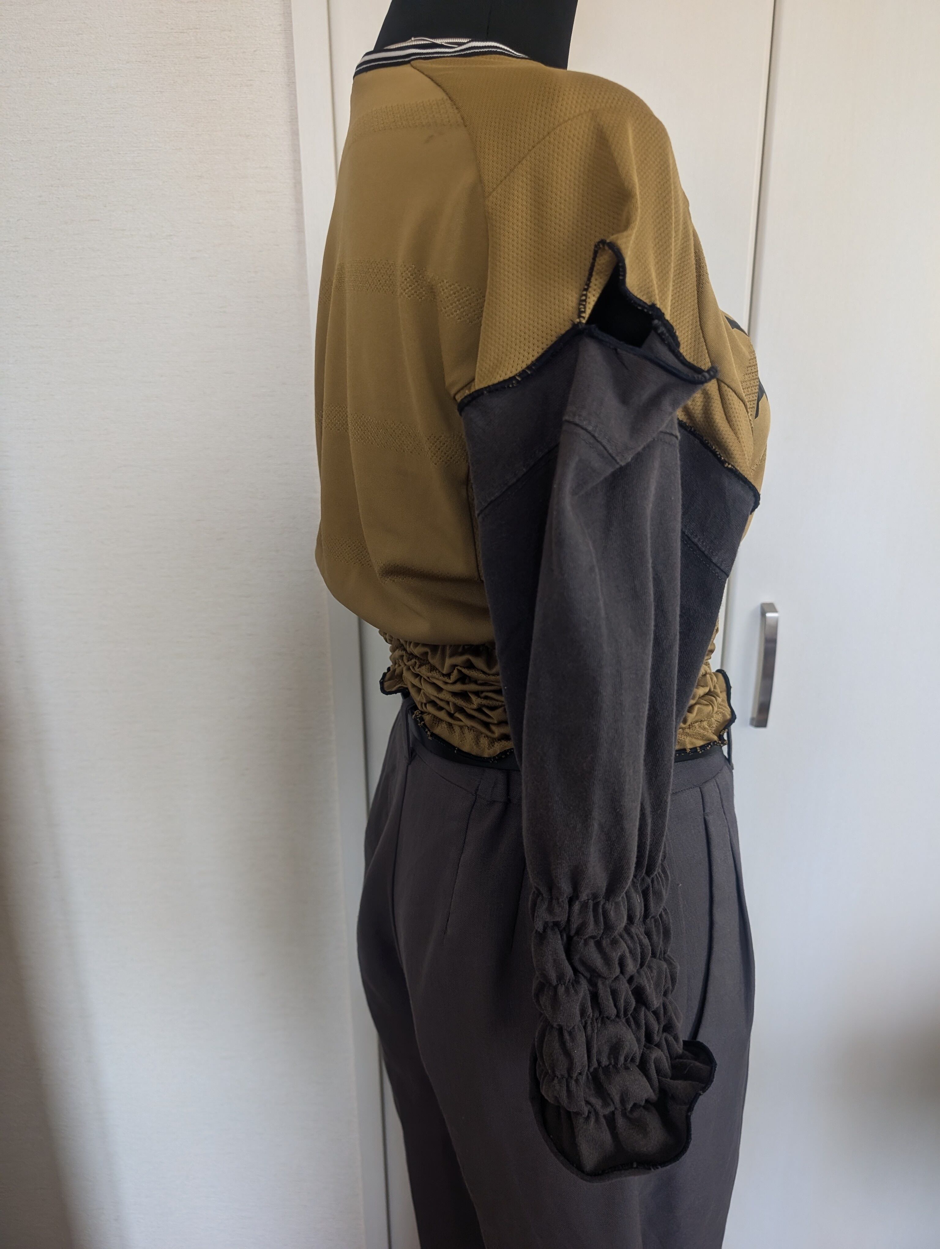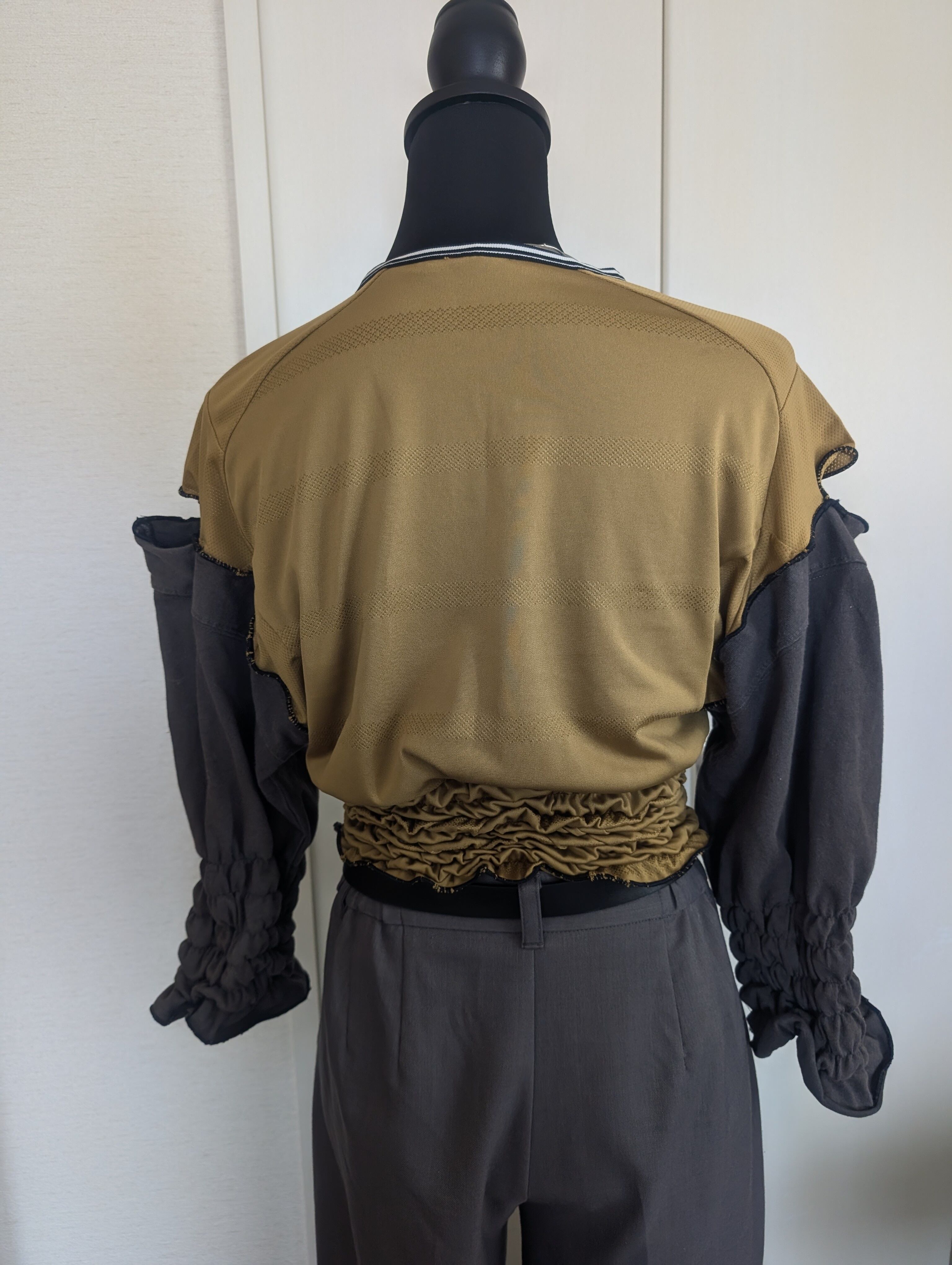カーキとグレーのギャザーデザインのカジュアルトップス。