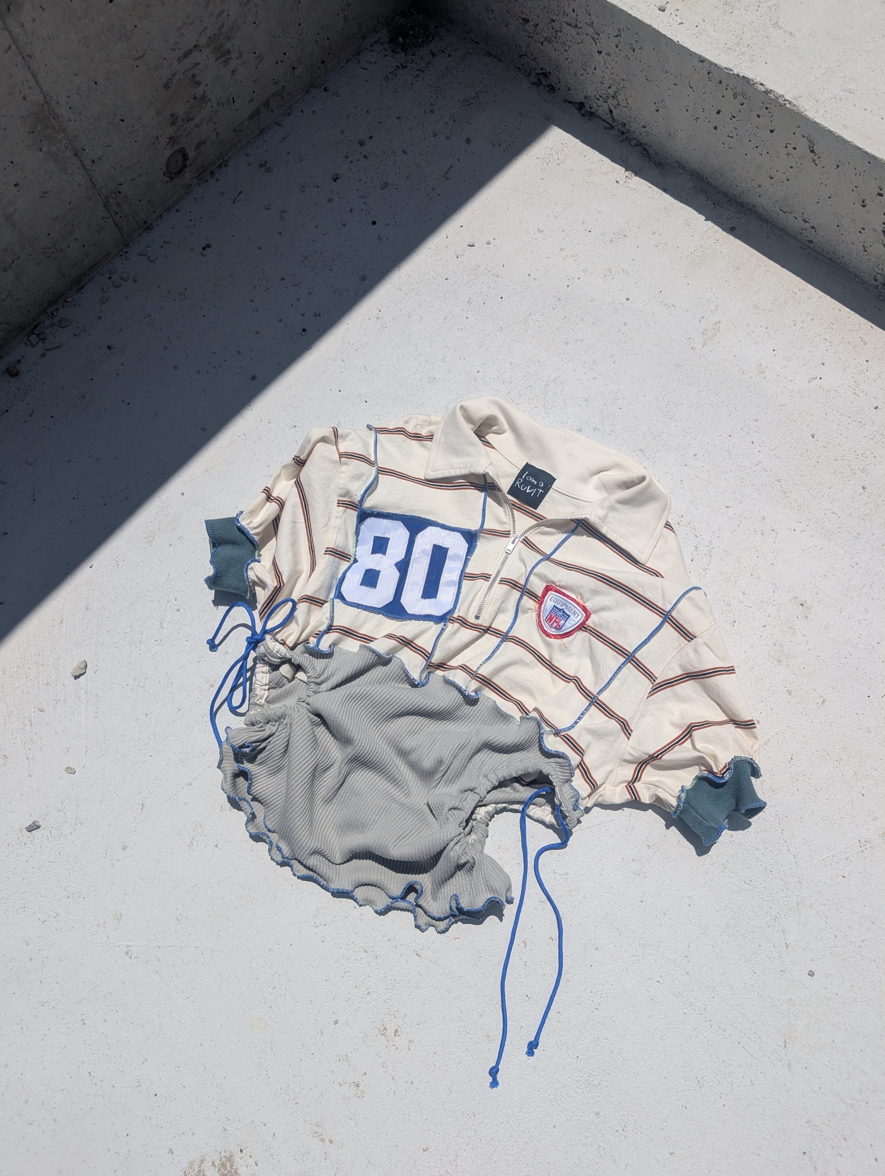 ストライプ柄ラガーシャツをリメイクしました、ドローストリング付きでスタイリッシュ。