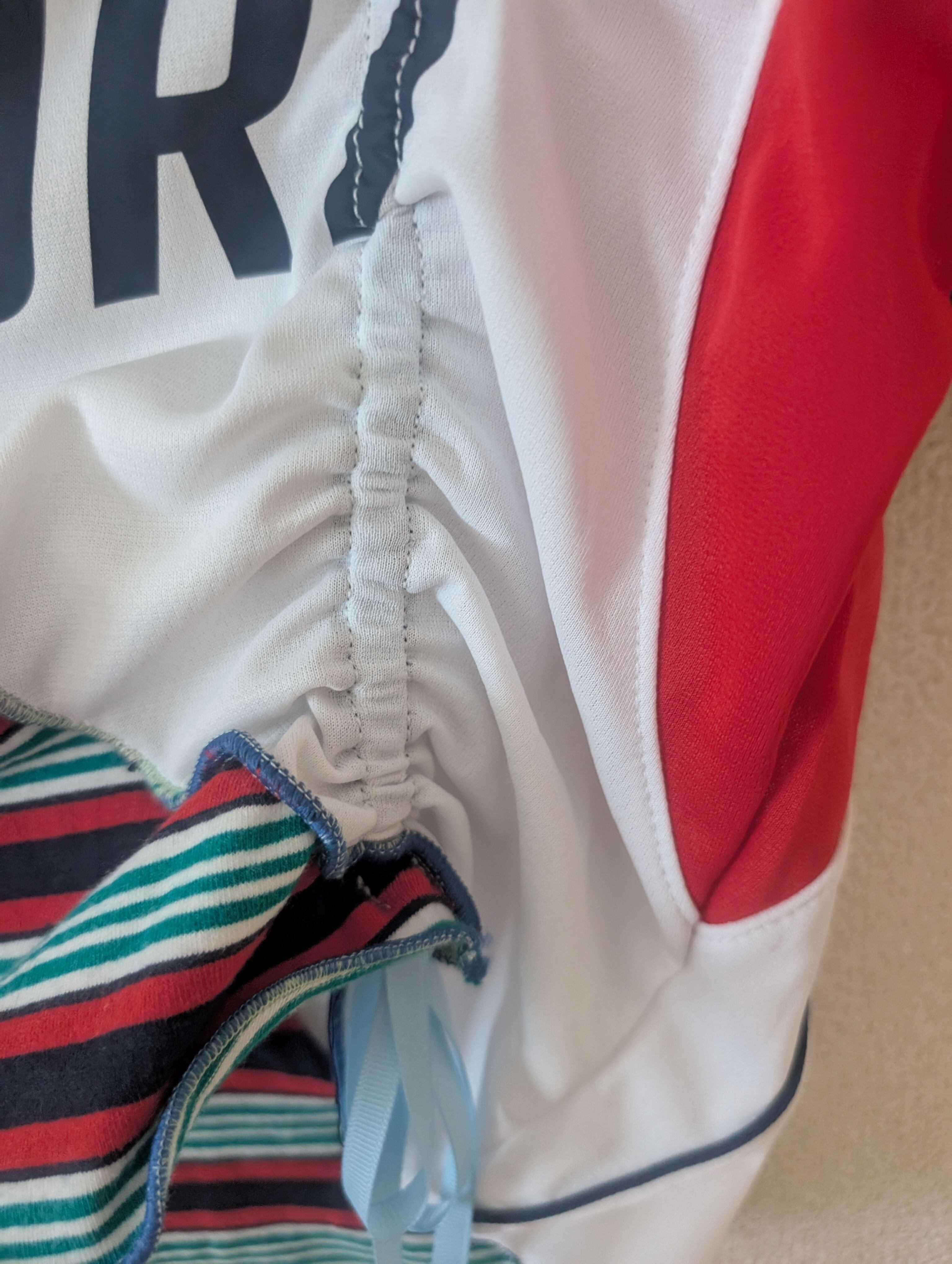 ボーダーTシャツとスポーツTシャツを組み合わせました。ギャザーを入れて、リボン付きに。