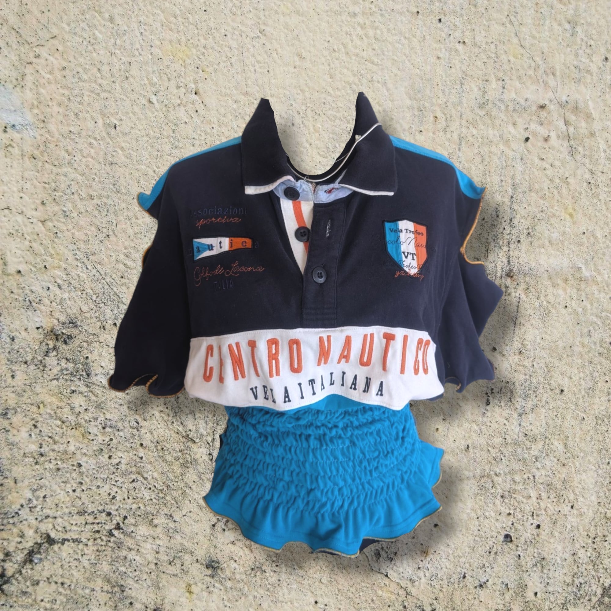 フリル付きデザインのネイビーラガーシャツ、カジュアルスタイルに最適。