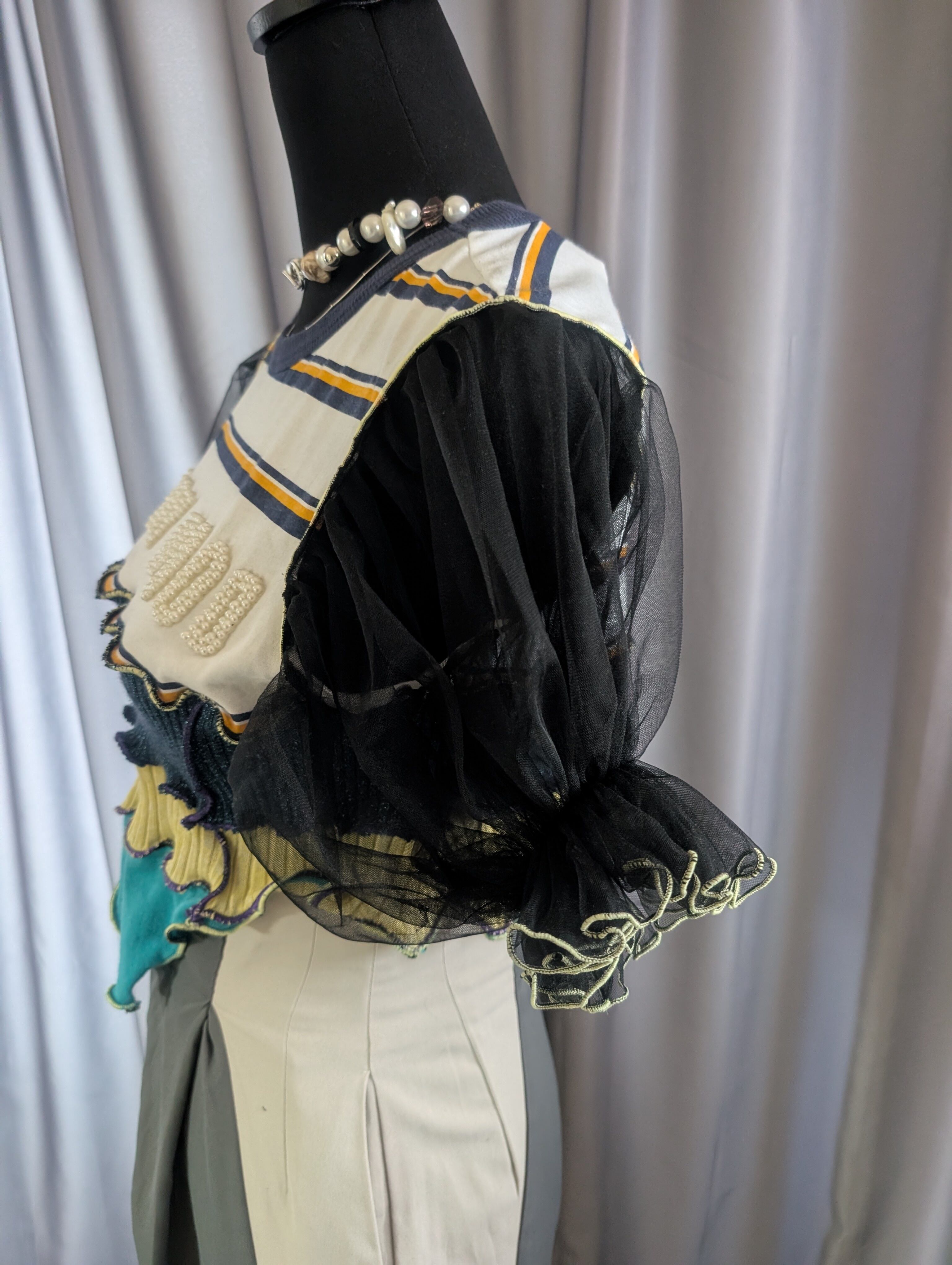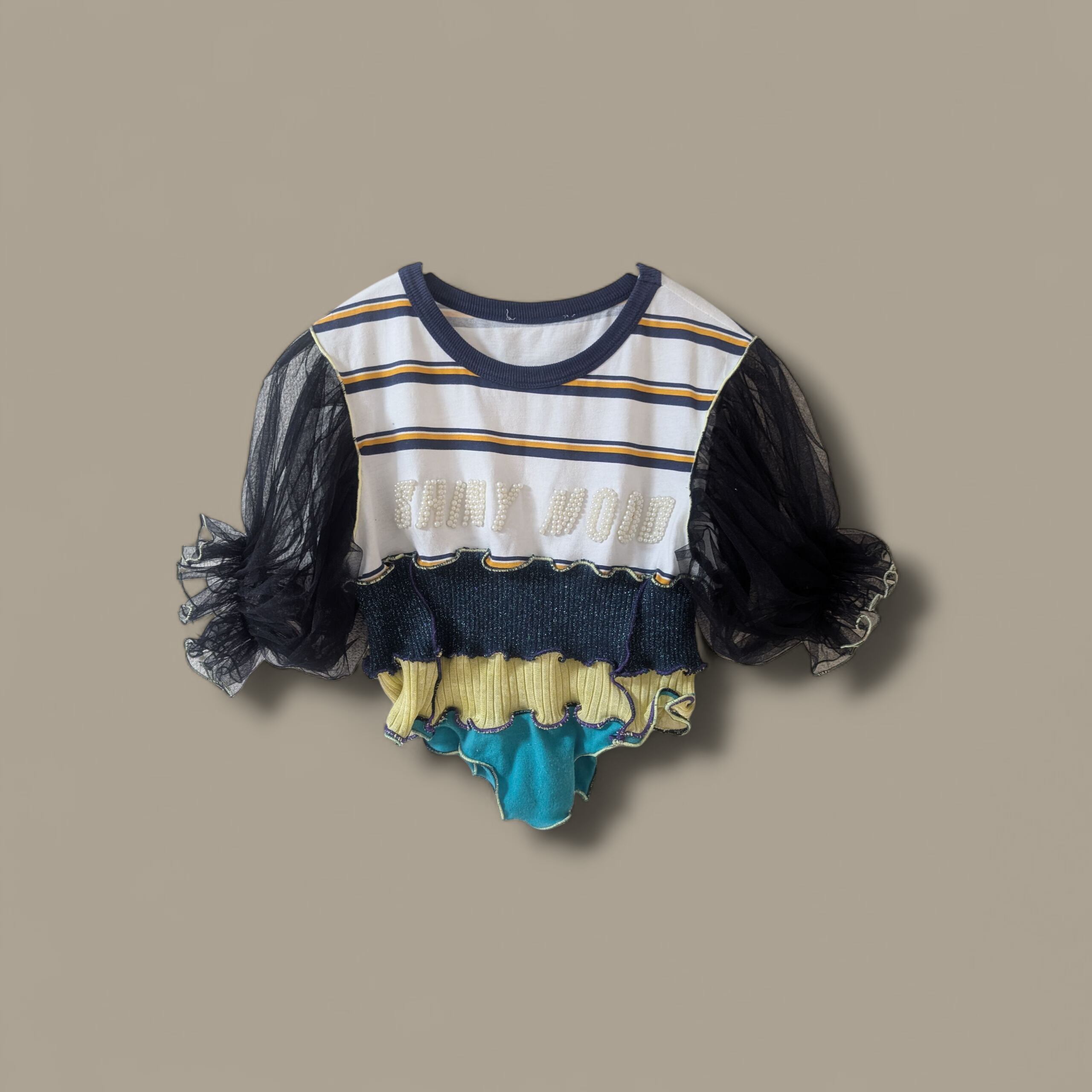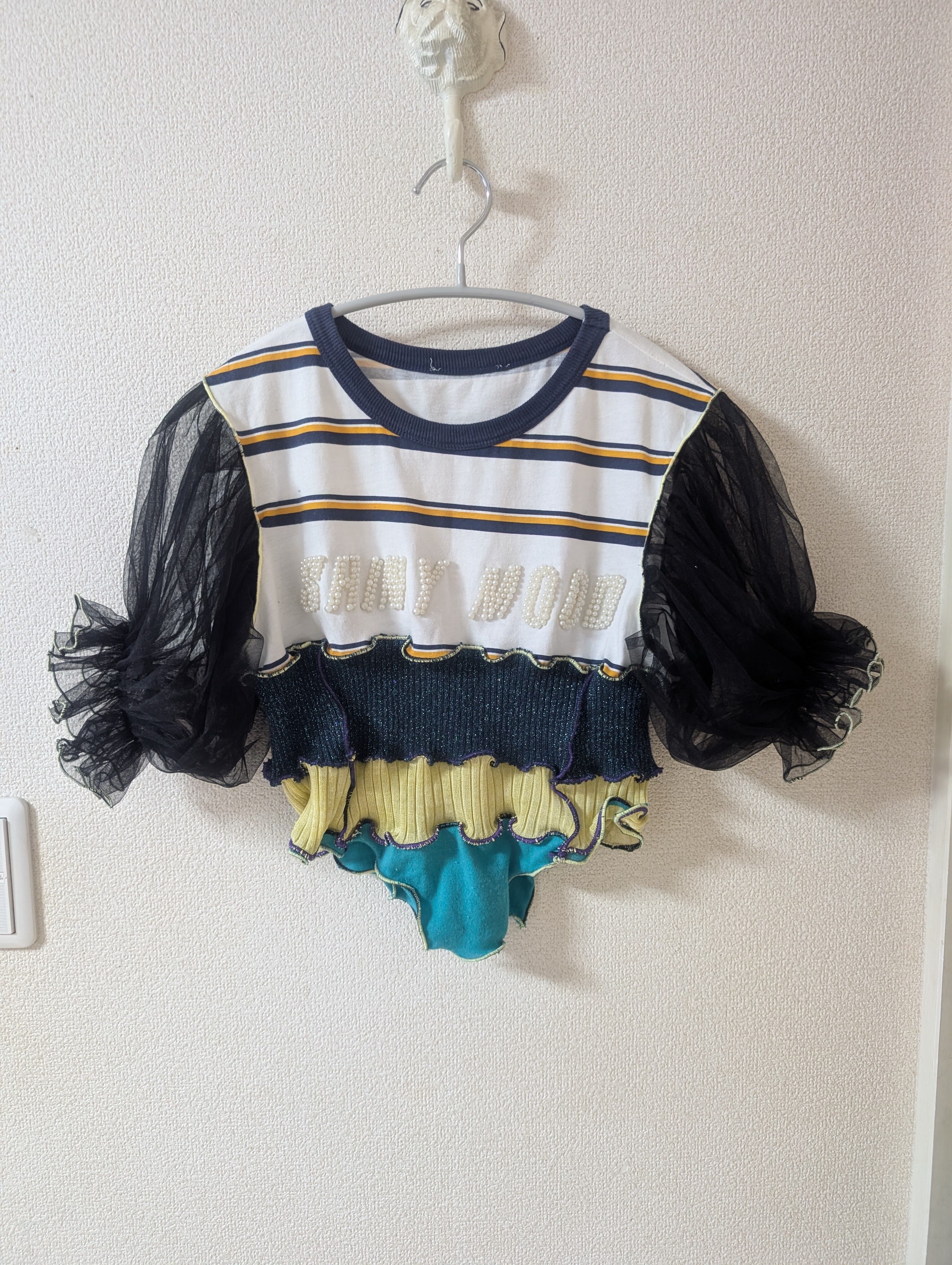 ストライプTシャツにニットをプラスして、チュールのフリル袖にしてみました。ユニークなデザインのカジュアルTシャツ。