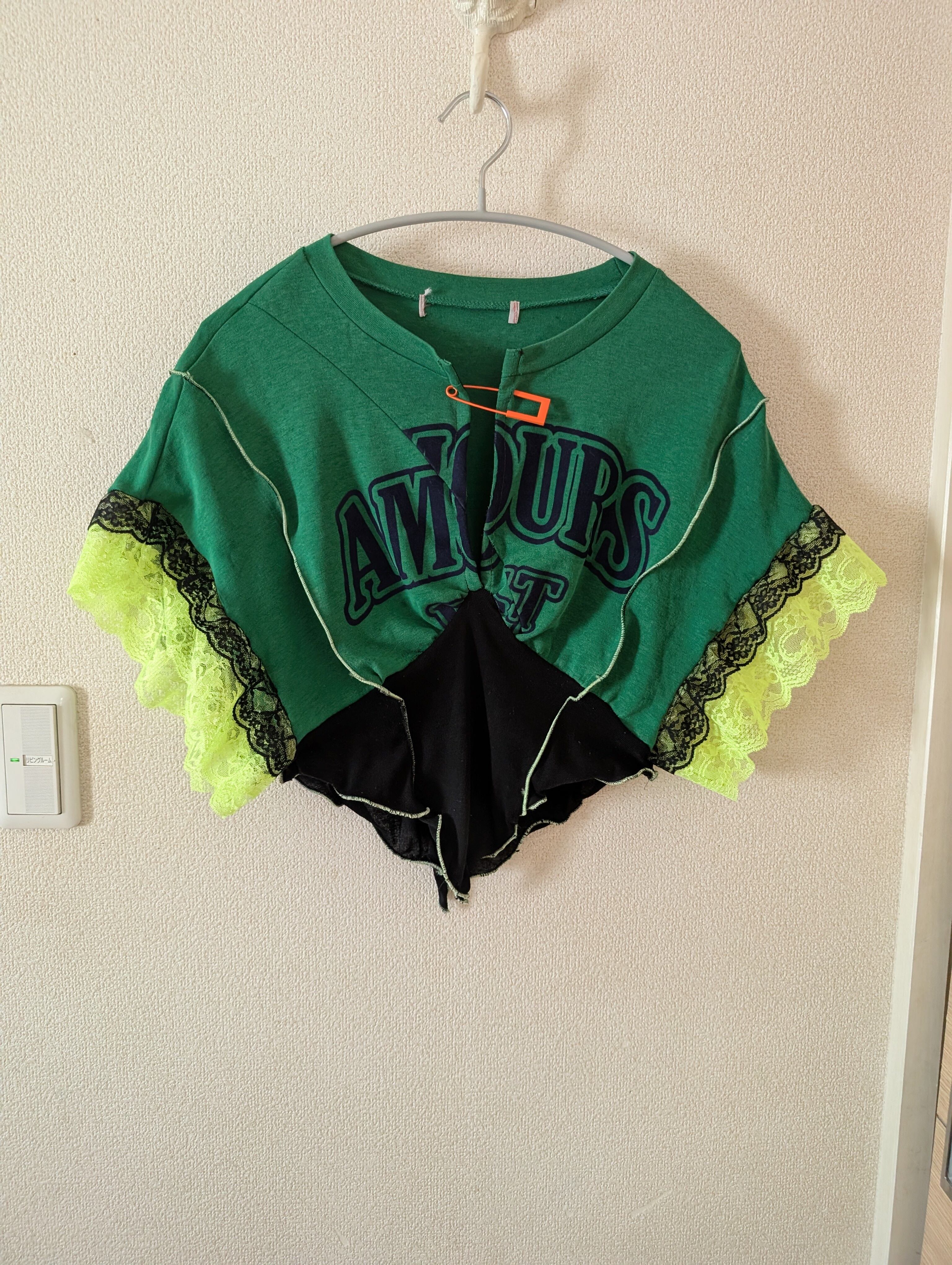 古着リメイクです!ユニークなグラフィックとレースが特徴のアシンメトリーなカットソーに仕上げました