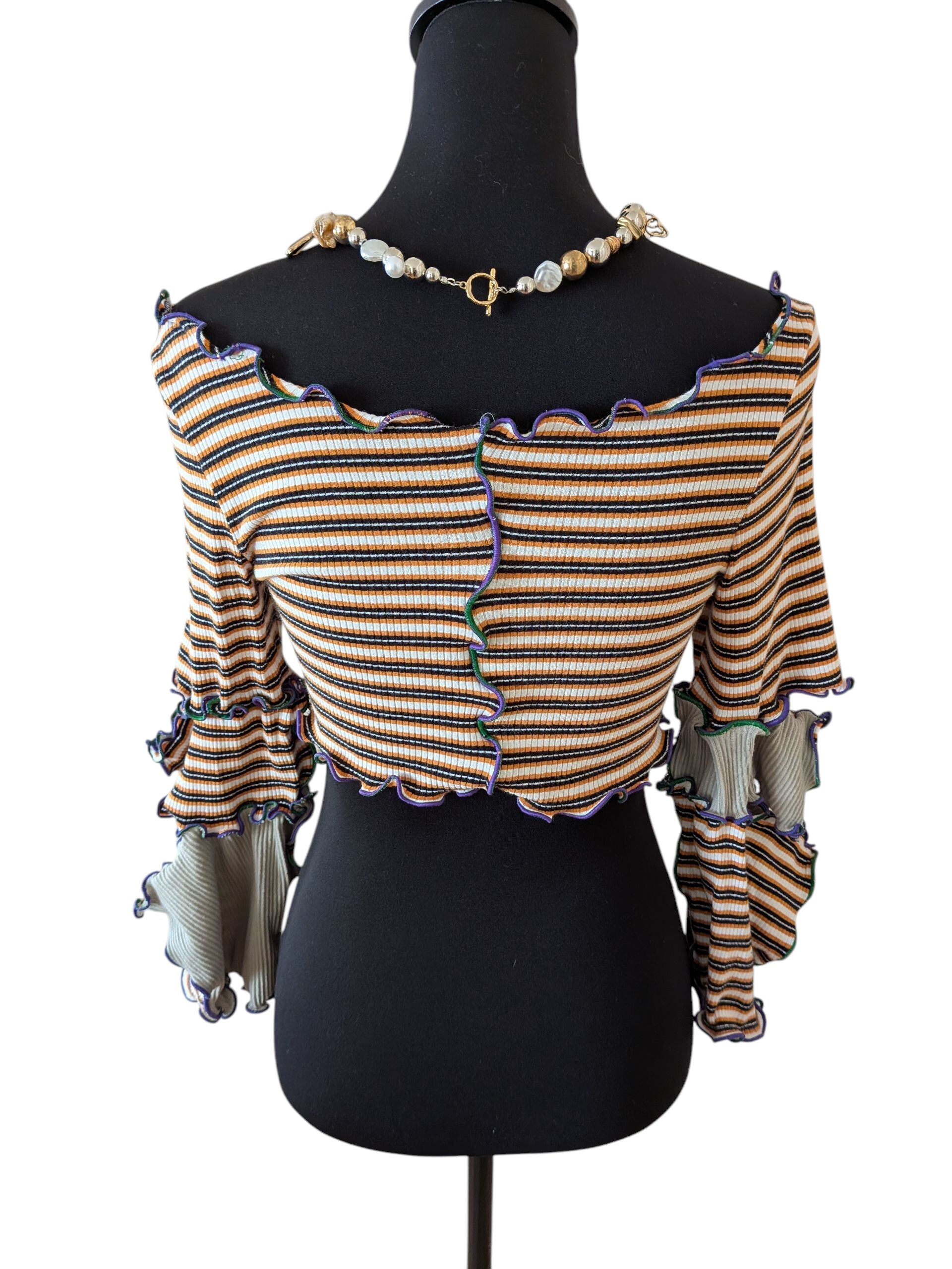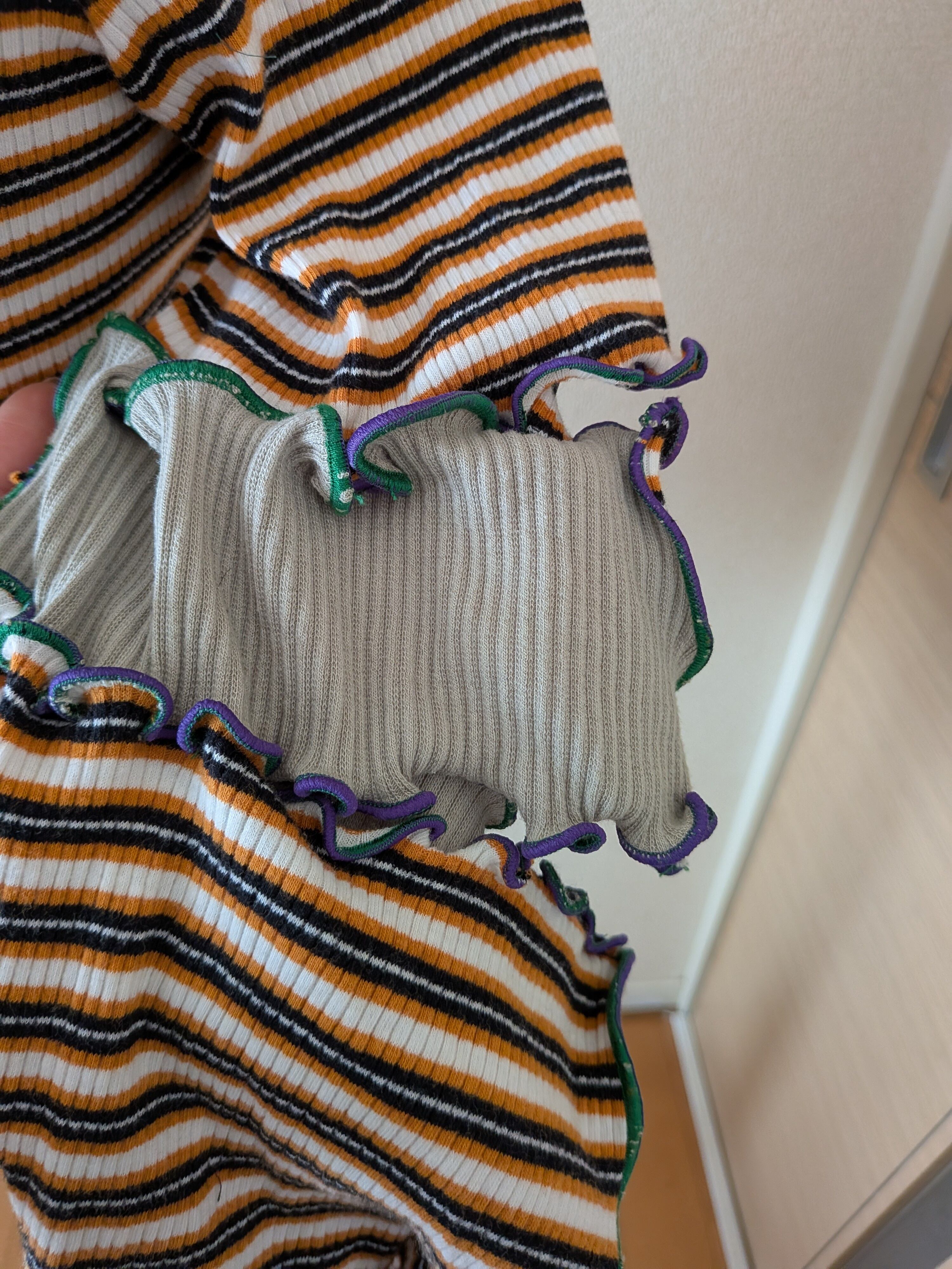 - 特徴: カラフルなストライプ、フリルの縁取り