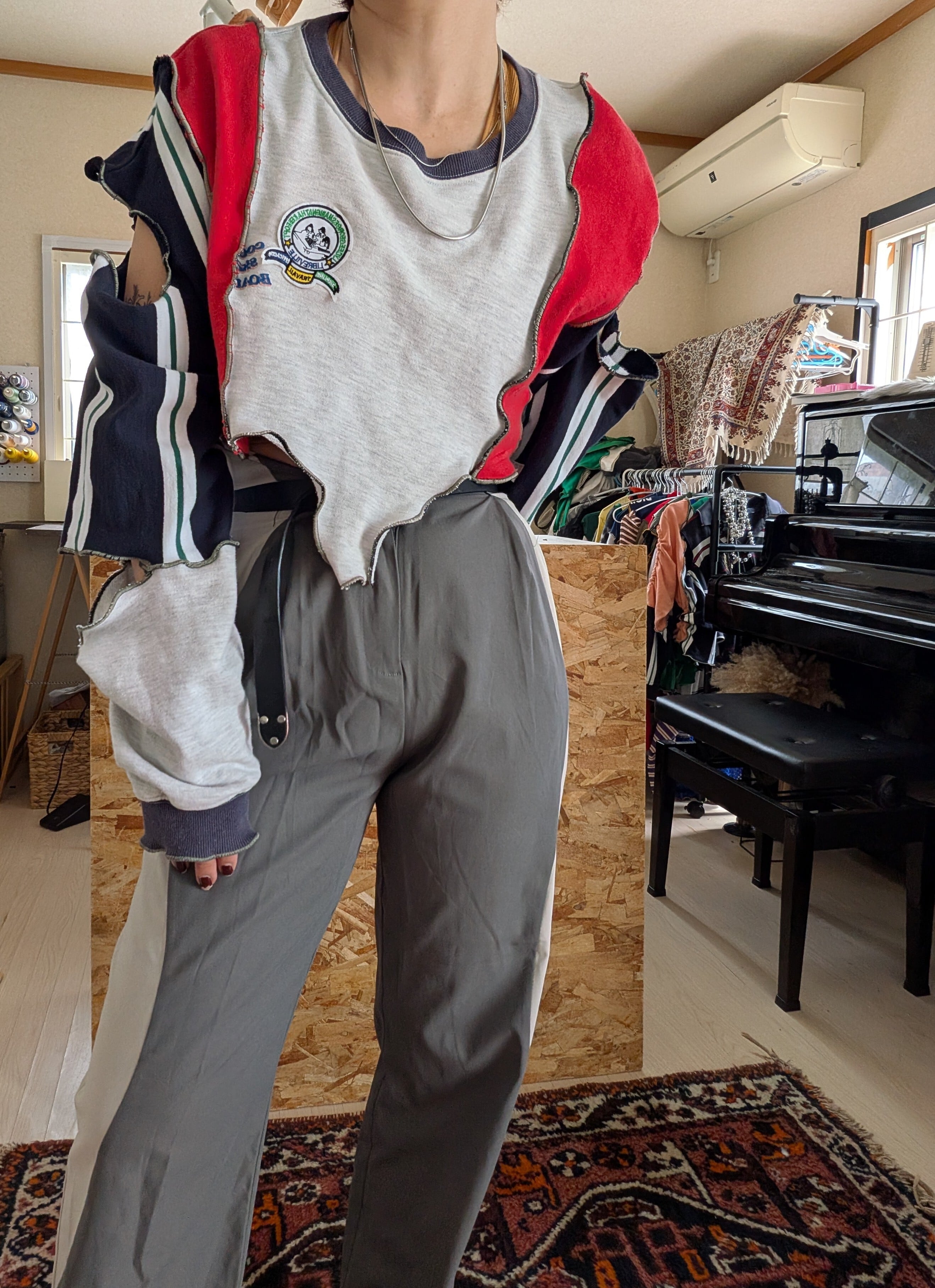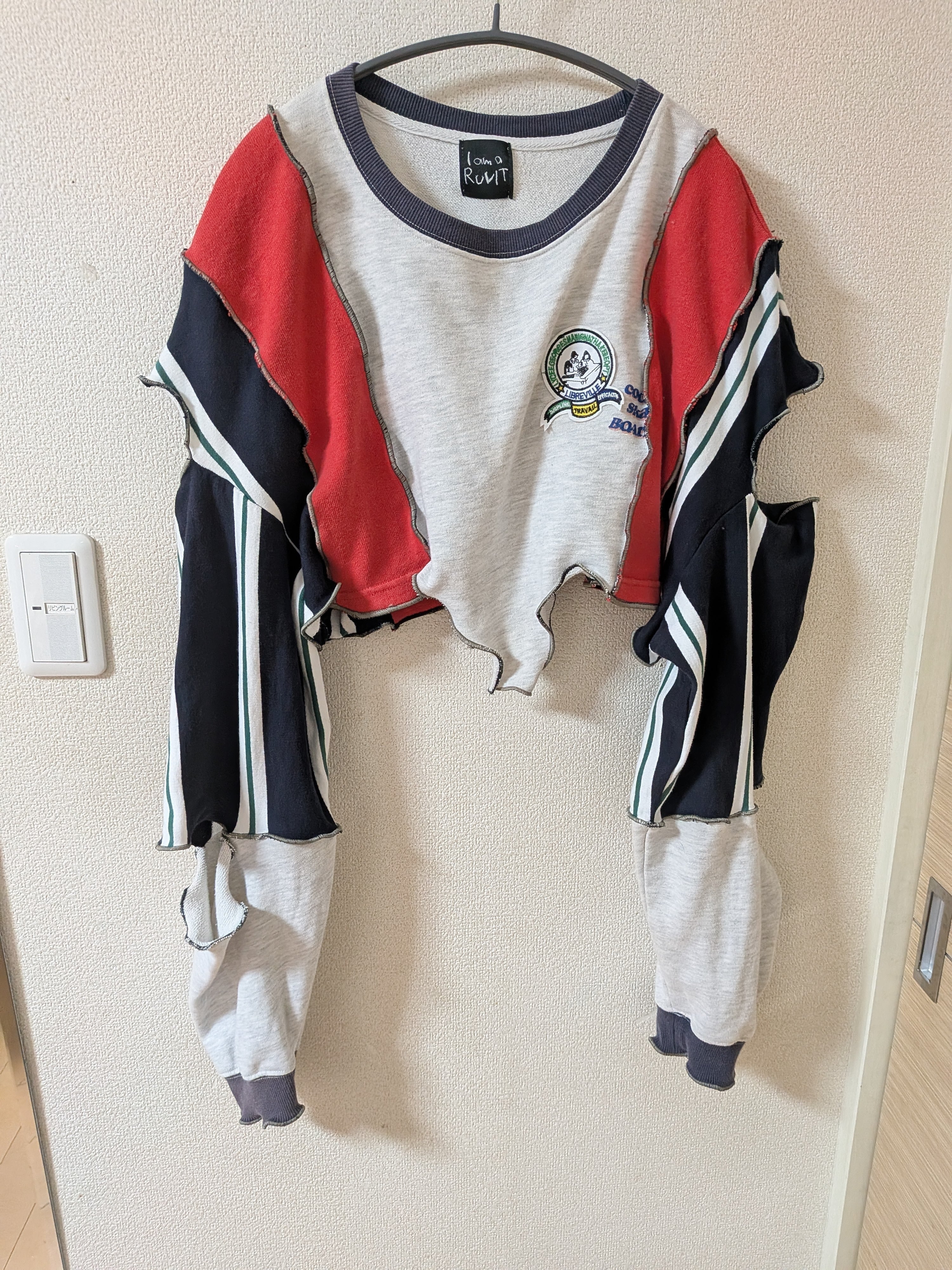 カットアウトデザインのクロップドスウェット、キャラクター刺繍付き。
