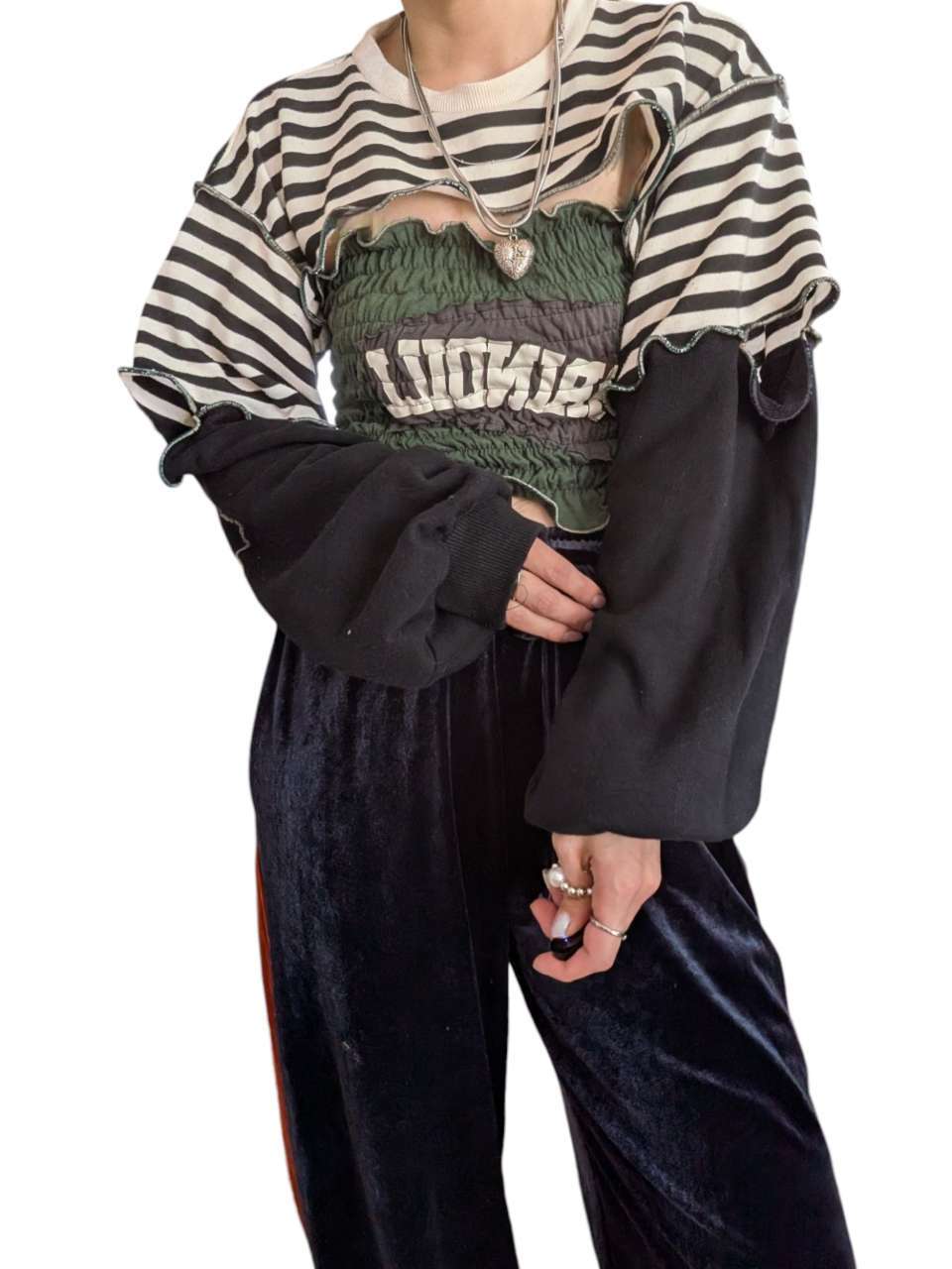 ストライプとフリルが特徴のクロップドトップスとビスチェのセット