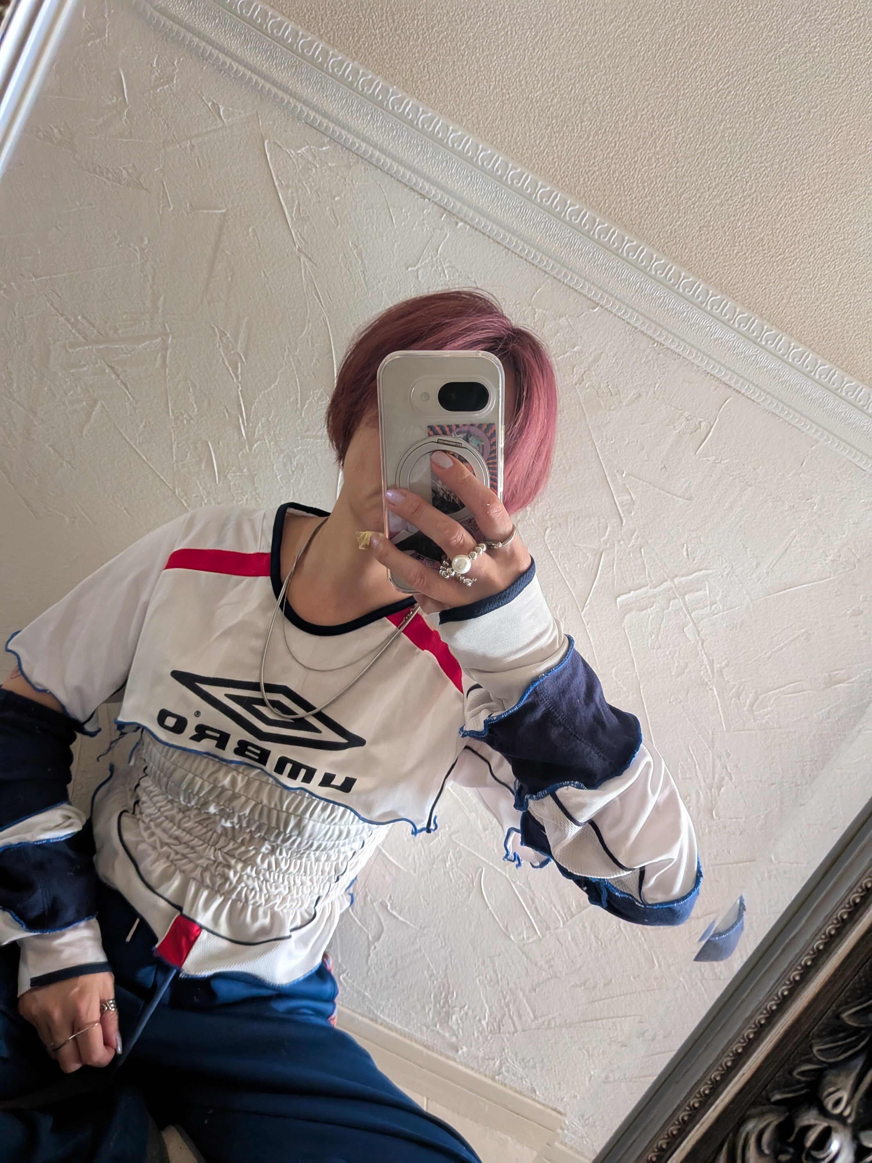 ホワイト・レッド・ネイビーのクロップドTシャツ、シャーリングデザインが特徴。