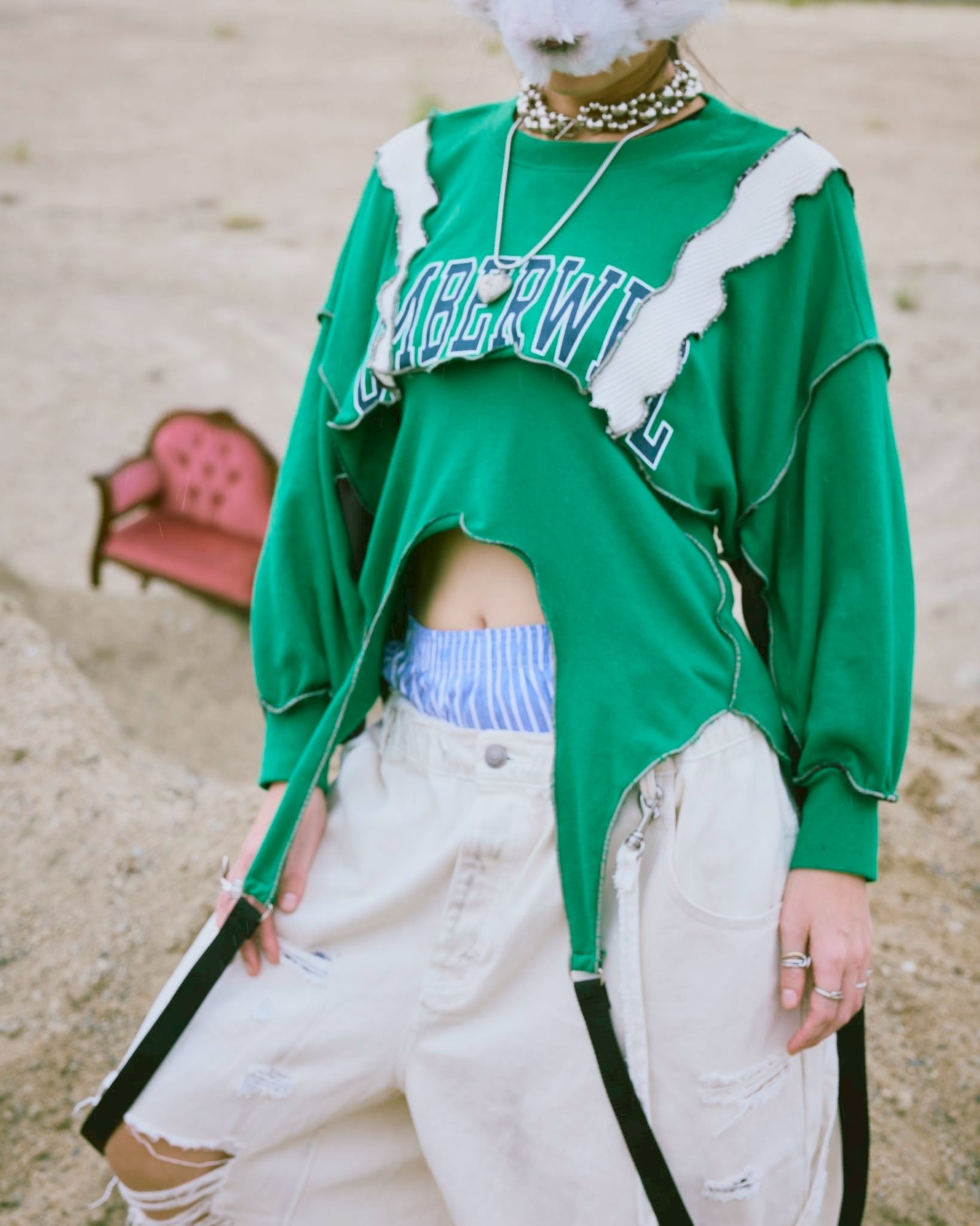 超ショート丈スウェットと、ガーターベルトデザインのグリーンスウェット、フリル付きで個性的なスタイル。