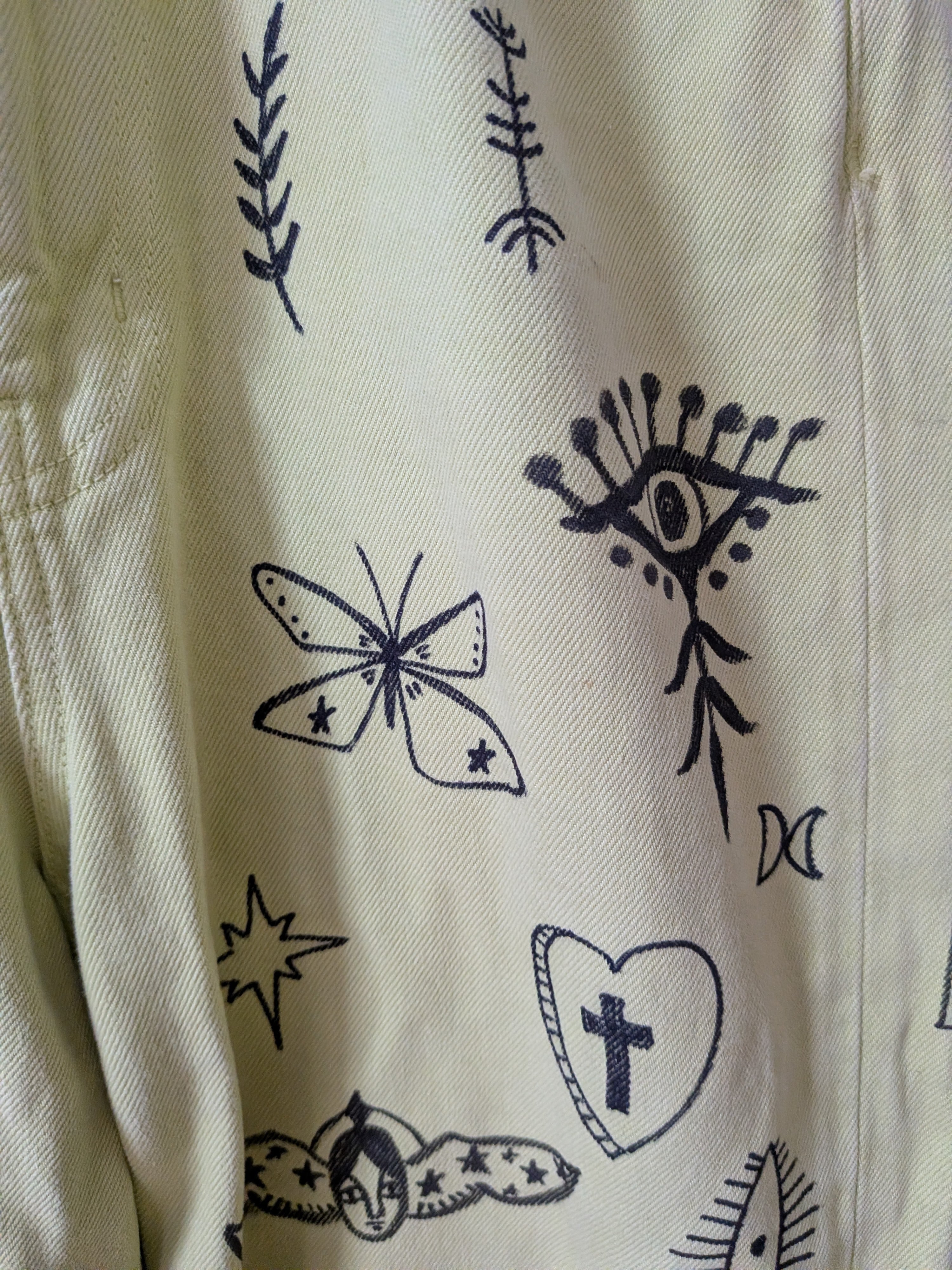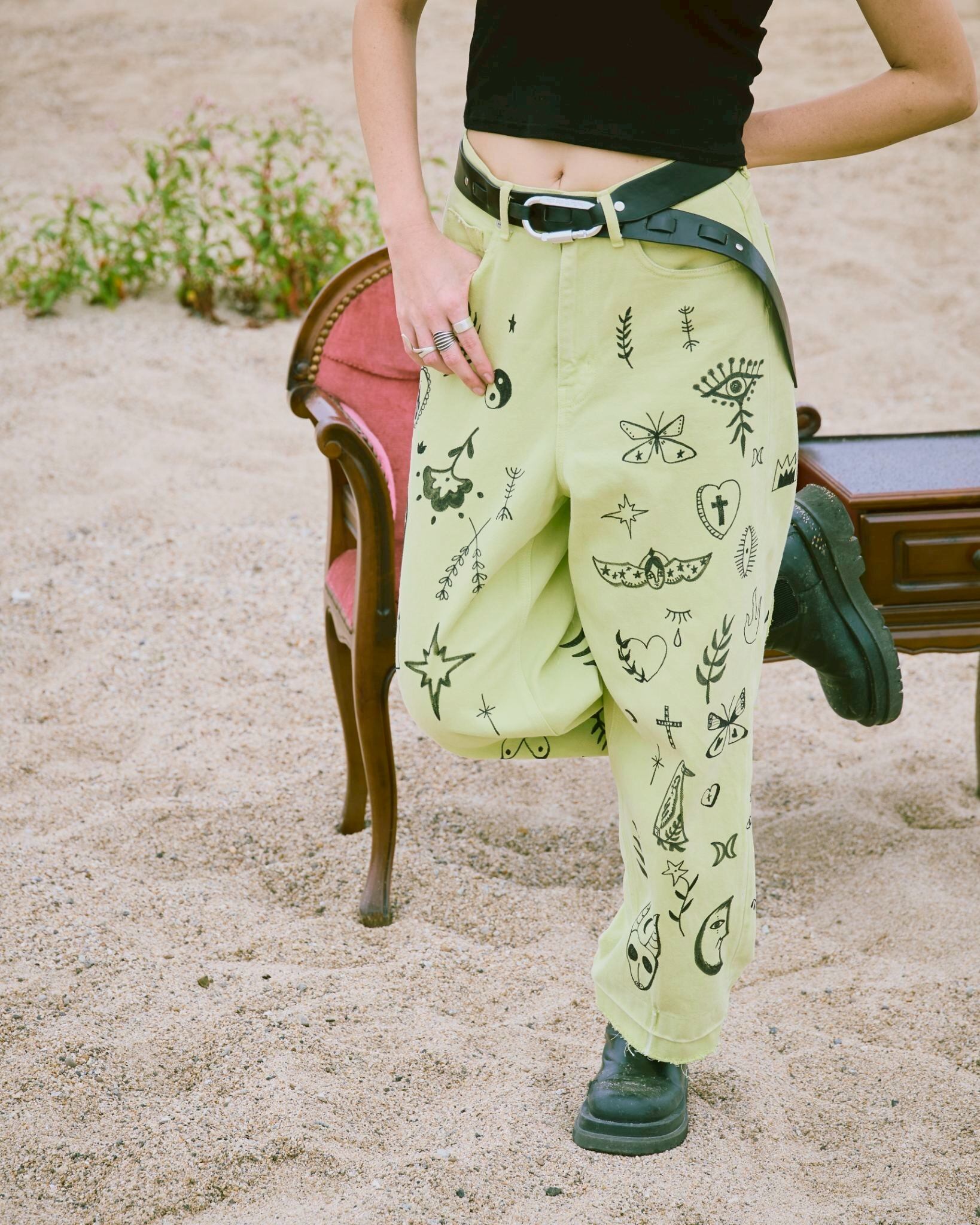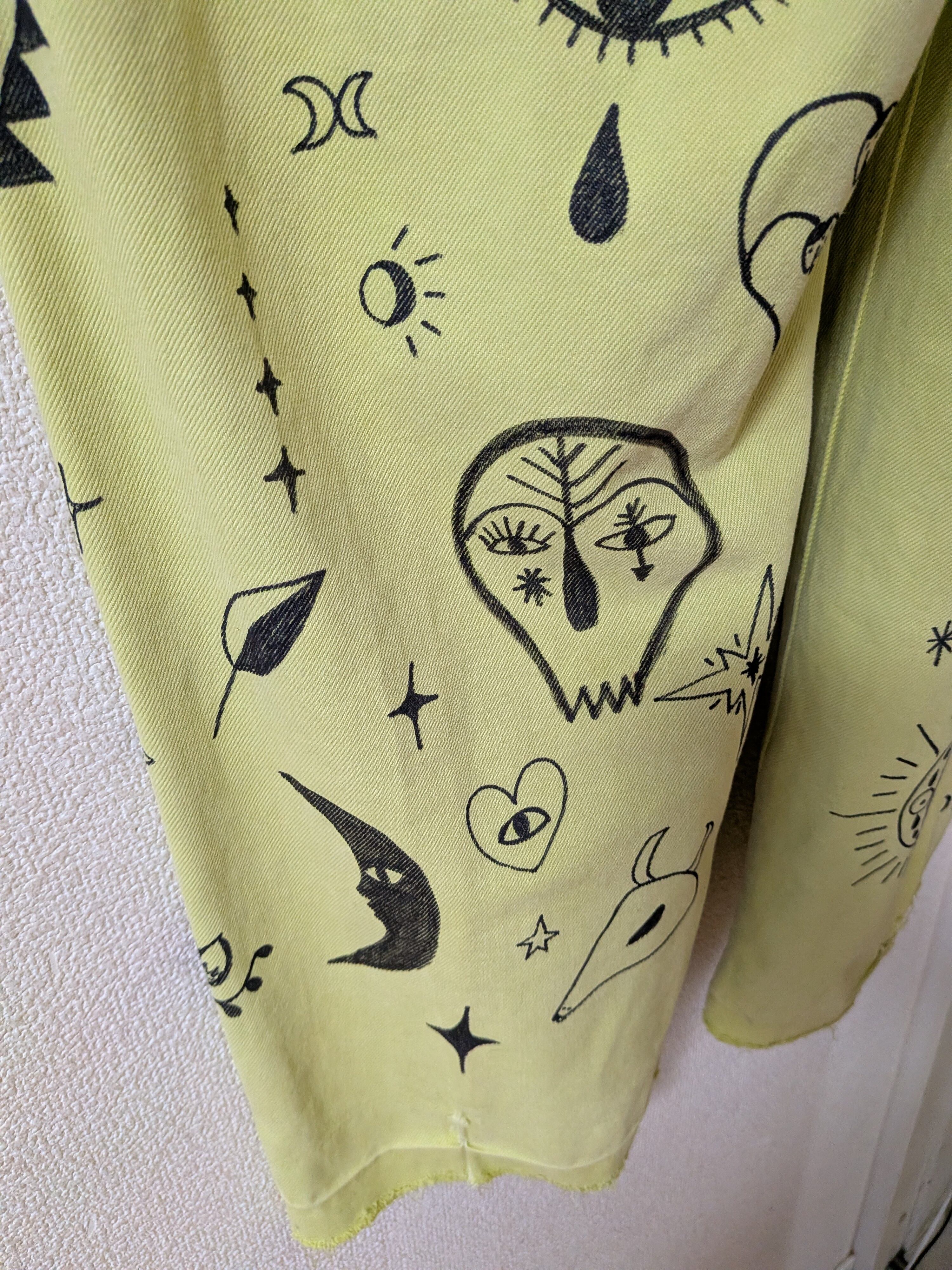 古着リメイクですユニークな手描きイラストが施されたライムグリーンのワイドパンツ。