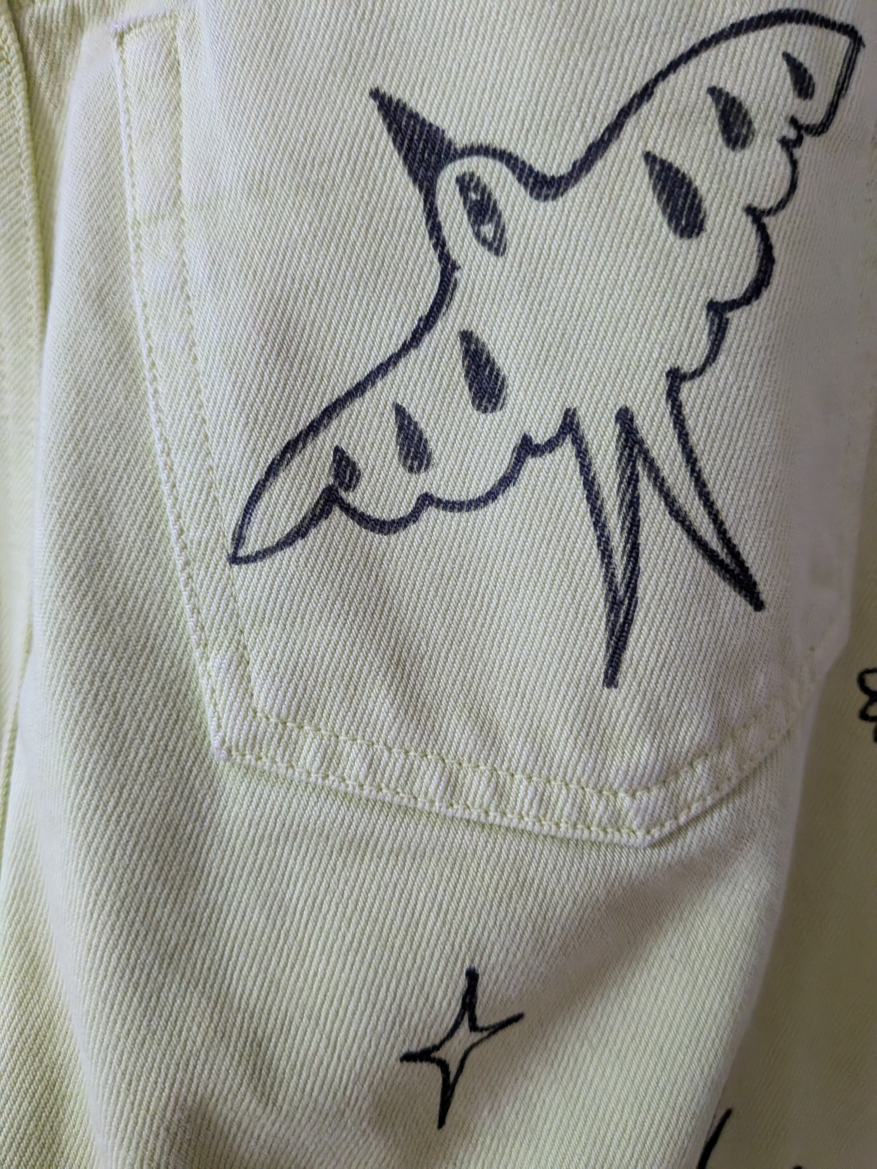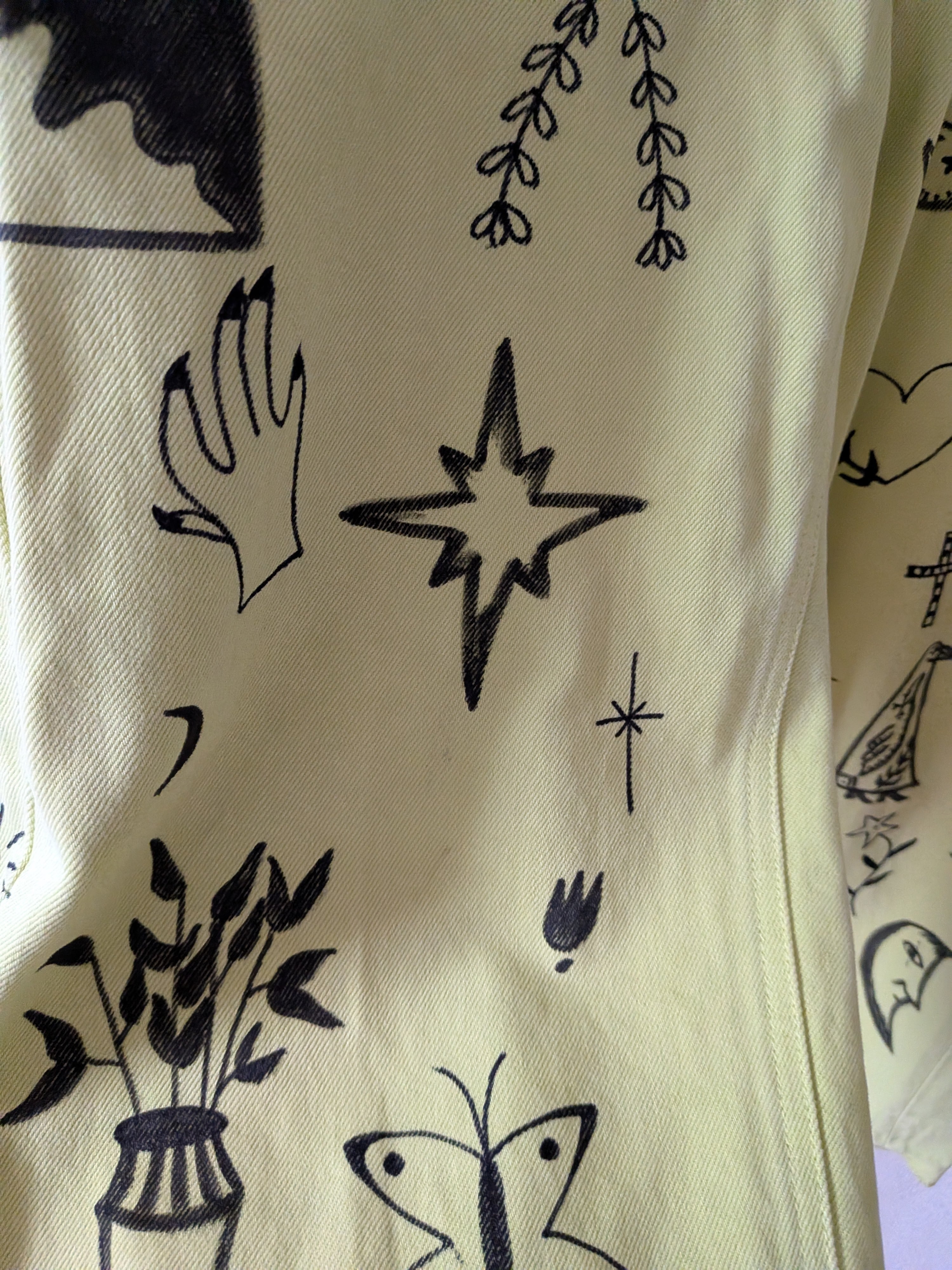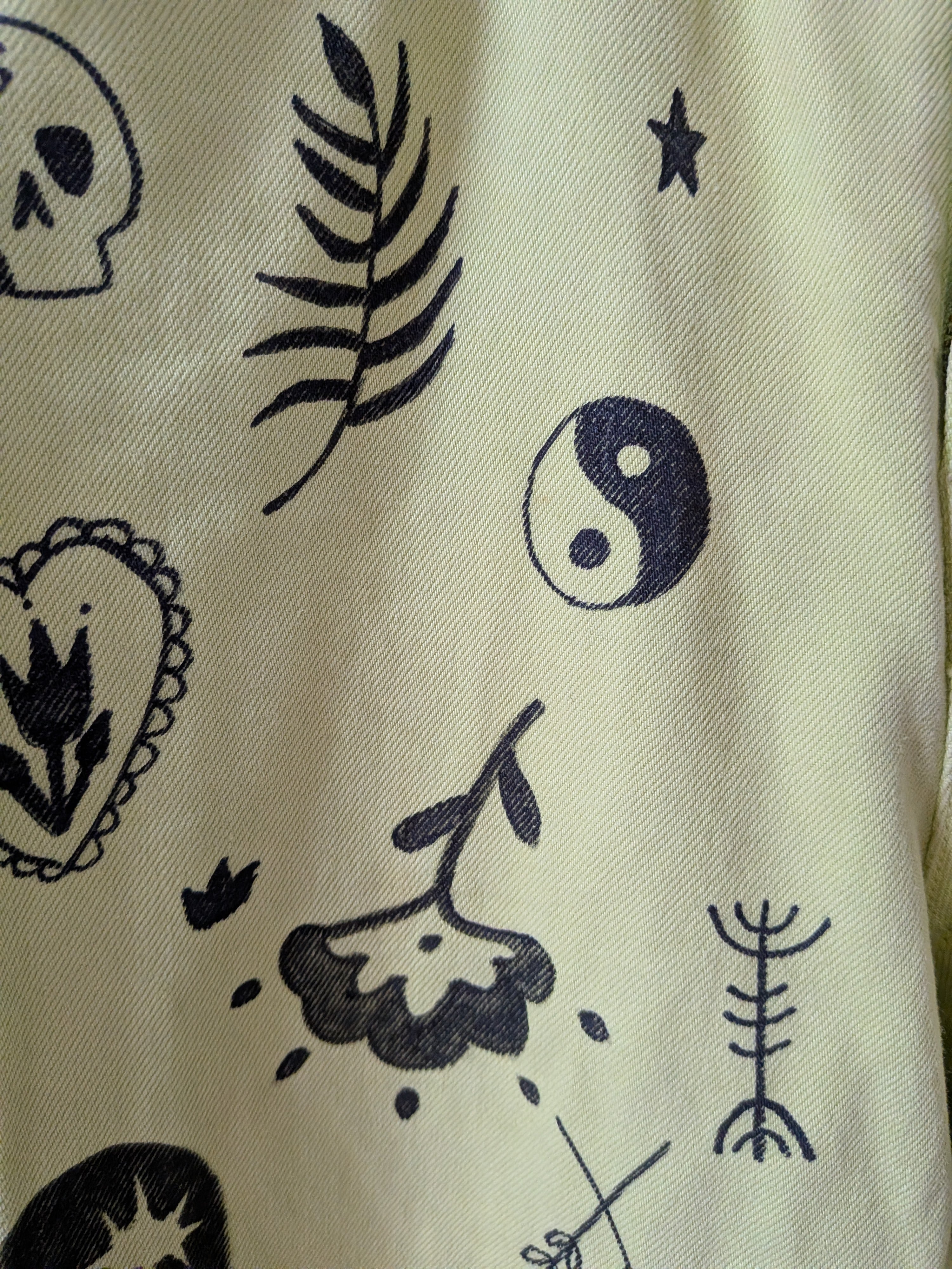 古着リメイクですユニークな手描きイラストが施されたライムグリーンのワイドパンツ。