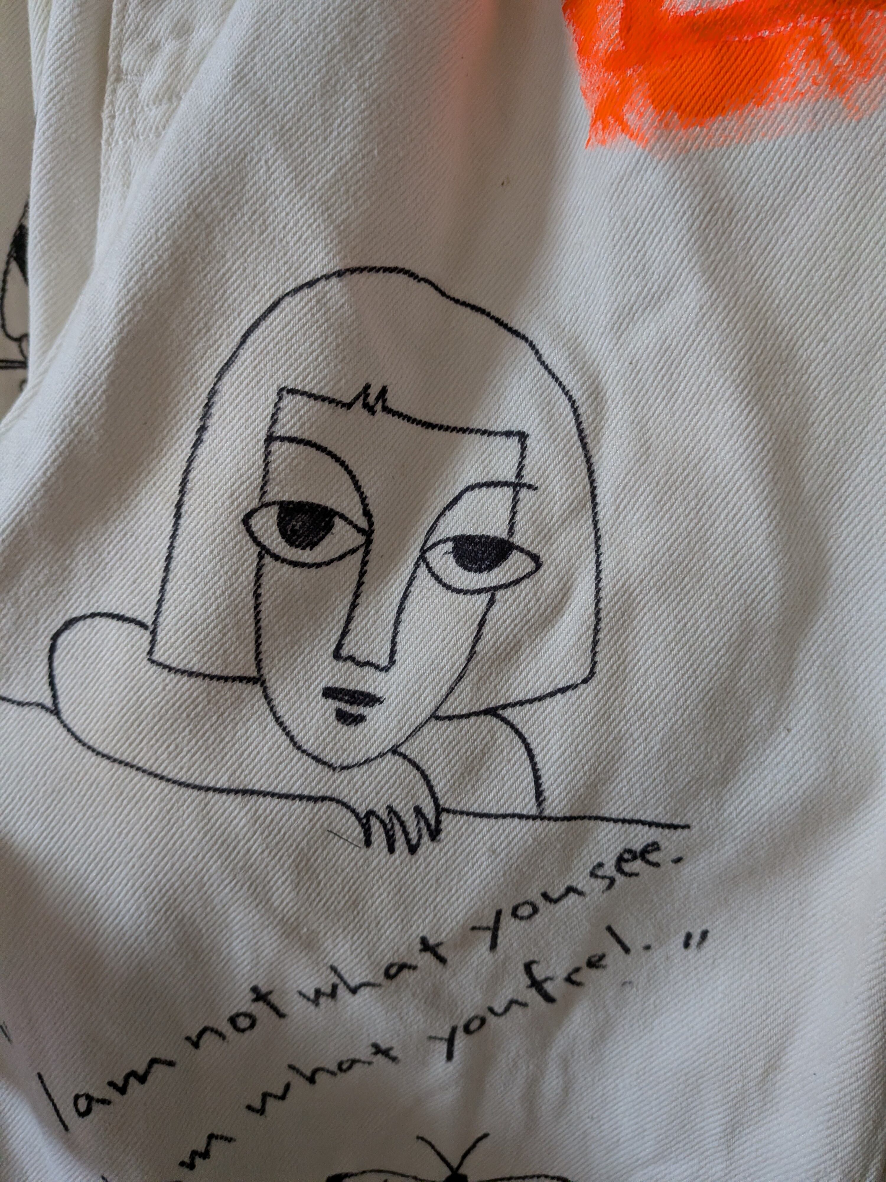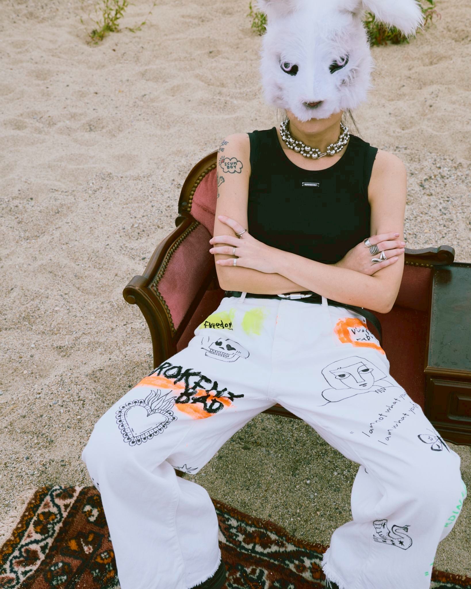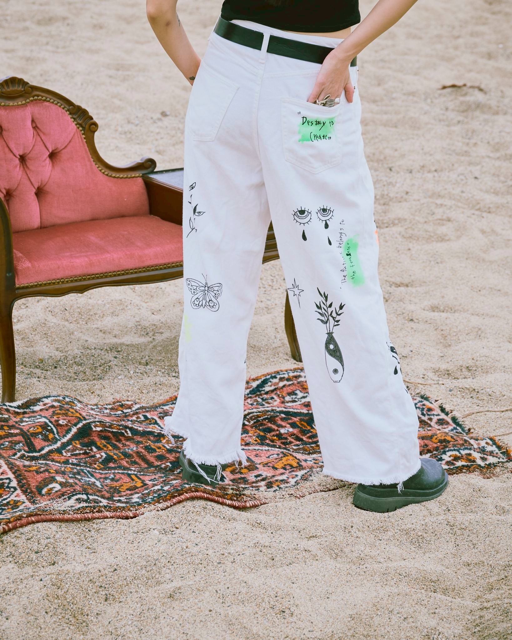 - デザイン: 手描きのグラフィックとメッセージが施されたホワイトデニムパンツ